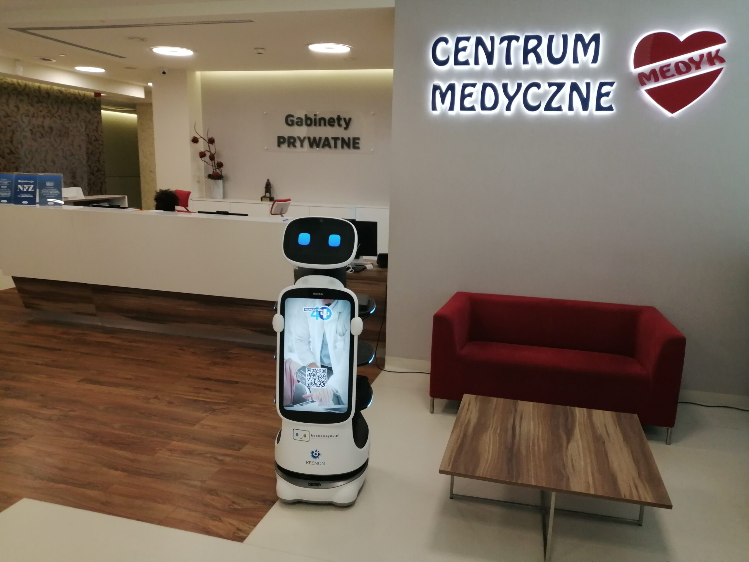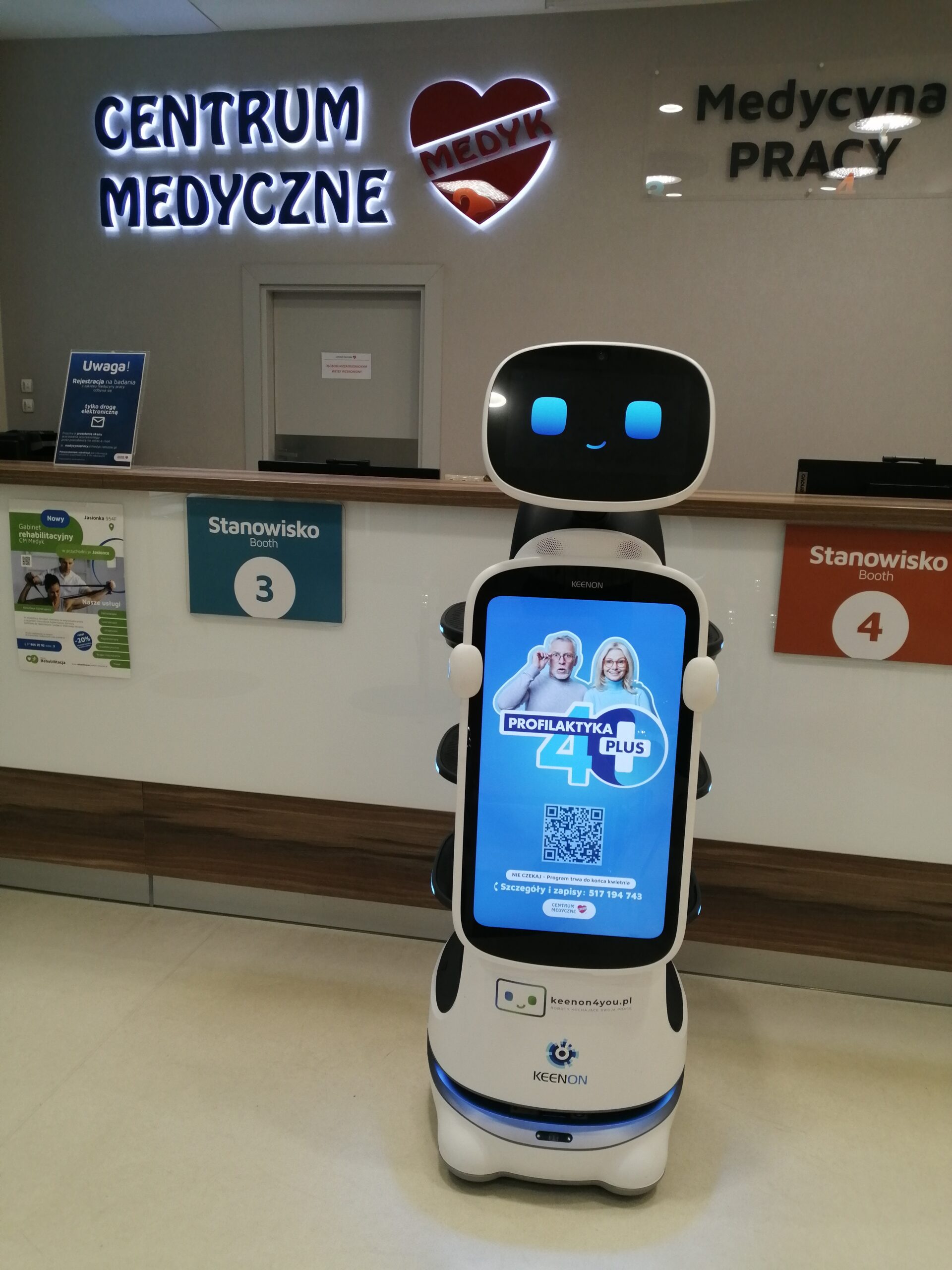 W przychodni Medyk w Rzeszowie robot Keenon skutecznie promował profilaktykę zdrowotną i badania 40+, prezentując na interaktywnym ekranie kluczowe informacje o programach profilaktycznych i ich znaczeniu dla wczesnego wykrywania chorób. Innowacyjny asystent przyciąga uwagę pacjentów, którzy chętniej zatrzymują się, zapoznają z materiałami edukacyjnymi i zapisują na badania kontrolne, co przekłada się na realny wzrost świadomości zdrowotnej. Pacjenci entuzjastycznie reagują na obecność przyjaznego robota, co dodatkowo wzmacnia przekaz o znaczeniu profilaktyki i buduje nowoczesny wizerunek przychodni.